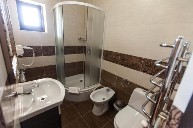 Делюкс (двухместный номер в светлых тонах) — двуспальная кровать, сейф, телевизор, санузел (душ, биде, туалет, умывальник), балкон.