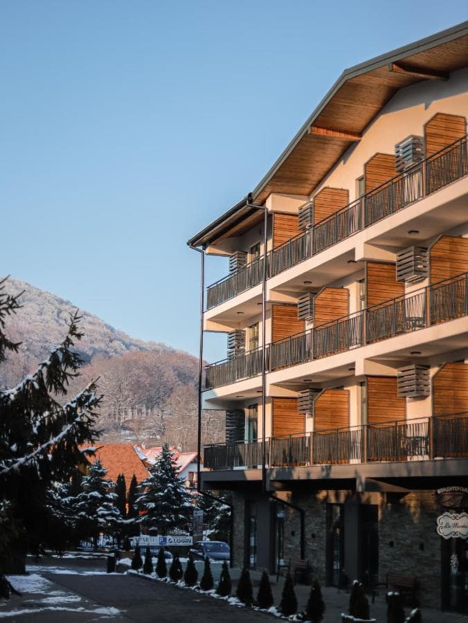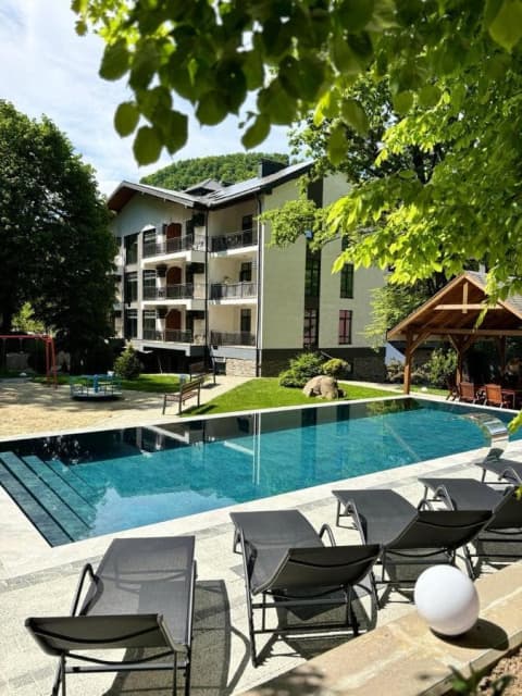 Отель «Apartel Shayan Eco Resort» расположился в самом центре Шаяна, рядом с бюветом минеральной воды «Шаянская» и главными санаторными комплексами. Его светлое здание в стиле альпийского шале является архитектурной доминантой центра поселка, которая видна почти отовсюду.