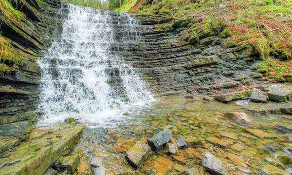 Только представьте, вашим глазам открывается картина: отвесная каменная лестница, по которой стекает бурный поток горной воды. Куда они ведут? Вверху лестница завершается туннелем из густого зеленого леса. Может быть, это путь в лесное царство? А может, распустила свои белые вьющиеся косы зеленоглазая матушка–природа? Чего только не придумает человеческое воображение. Но именно такое впечатление складывается рядом с еще одним удивительным Кудринецким водопадом. Уникальность водопада в его «строении». Водограй проложил себе путь на скальном массиве флишового типа. Именно из этих наслоений образуется бесчисленное количество каскадов, внешне напоминающих ступеньки, или вьющиеся волосы.